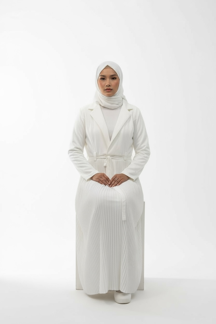 This sophisticated coat-style abaya features a gracefully pleated flare silhouette crafted from lightweight georgette. The reinforced upper bodice incorporates elastane for enhanced durability and shape retention. An adjustable fabric belt allows you to customize the fit to your preference. The Amber Coat exemplifies contemporary abaya design with refined tailoring and premium construction.