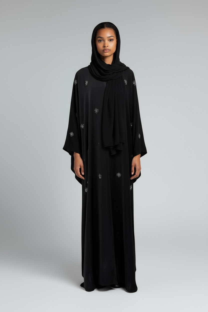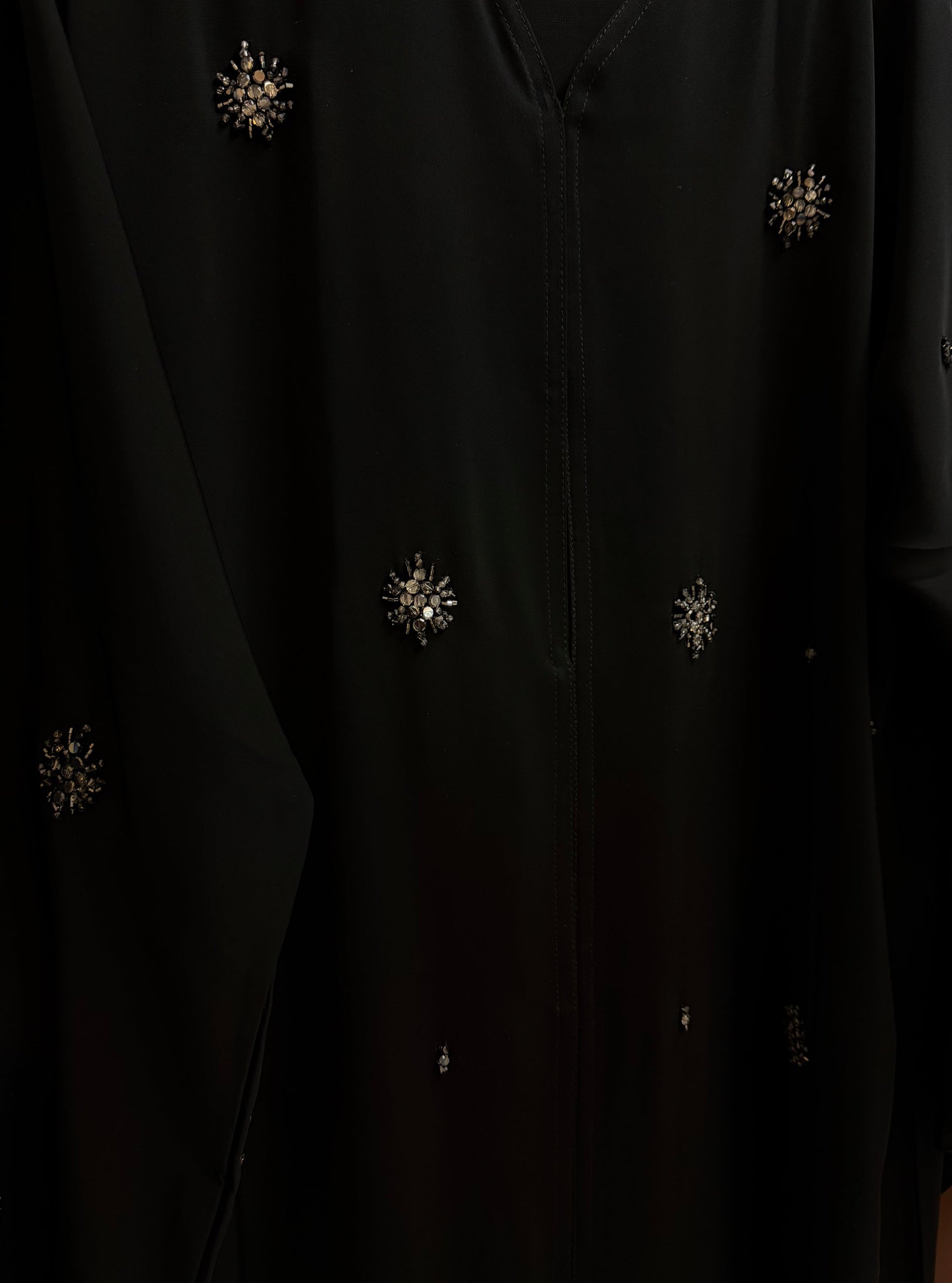 New Regal Abaya is a premium hand embroidered Abaya with motifs style of embroidery and a delicate beaded border on the scarf.