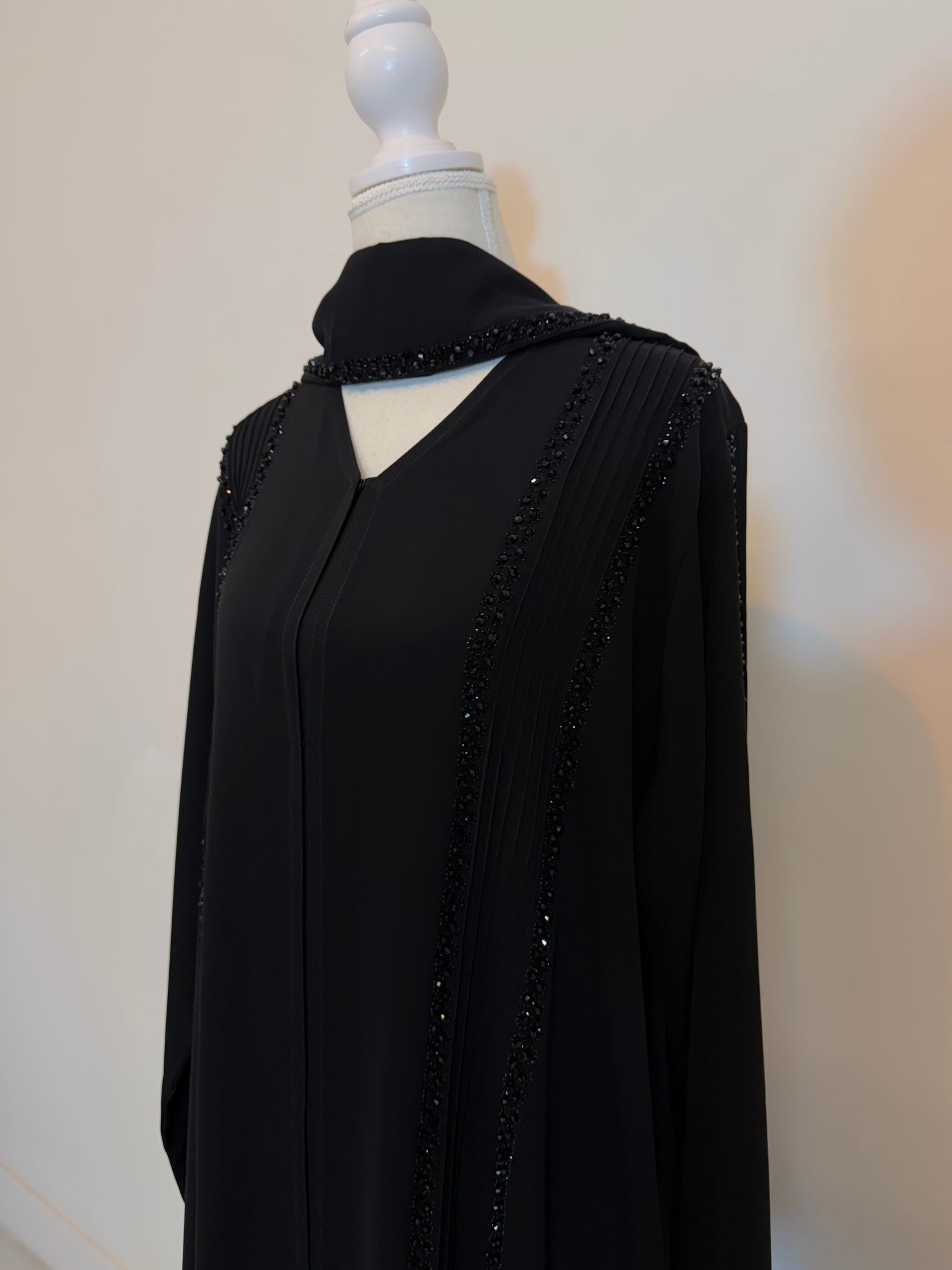 New Saba Abaya is a premium hand embroidered Abaya with panel style of embroidery and diamante' work on sleeves , front and back, and a delicate beaded border on the scarf.