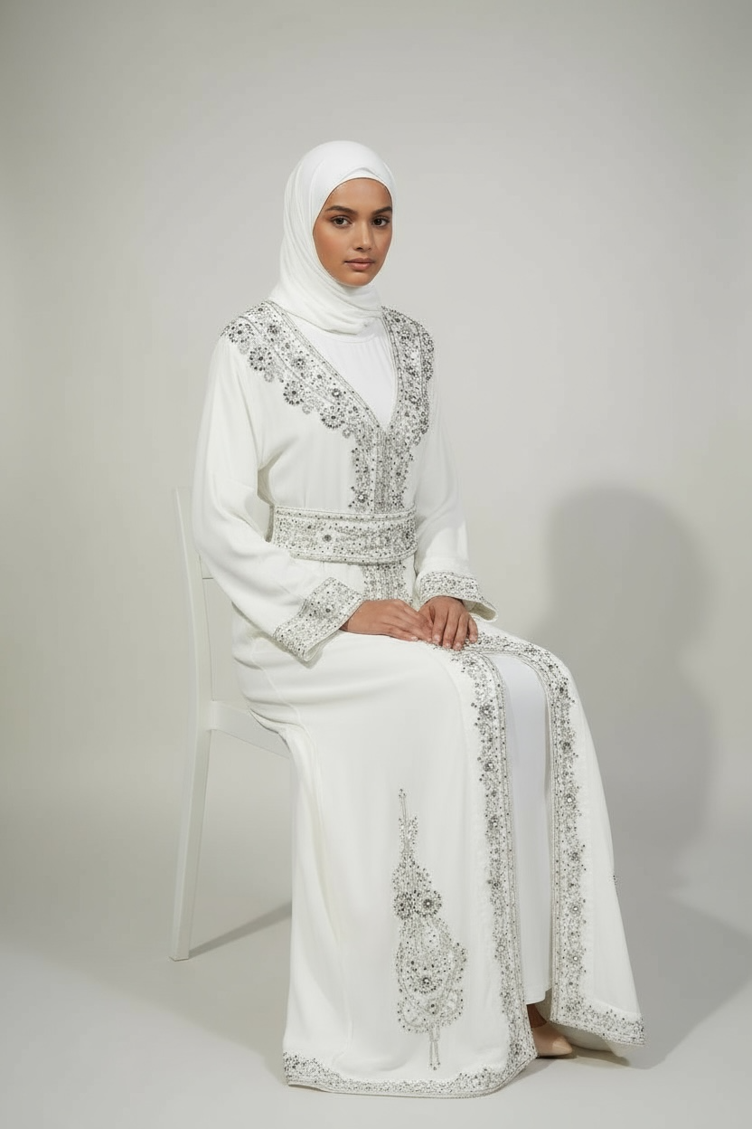 A true Royal design, Moroccan Style Takshita dress with heavy handwork embroidery and crystals on full-body design, and embroidered belt. It has a double layer of Fine georgette with a slit cut on the outer layer.